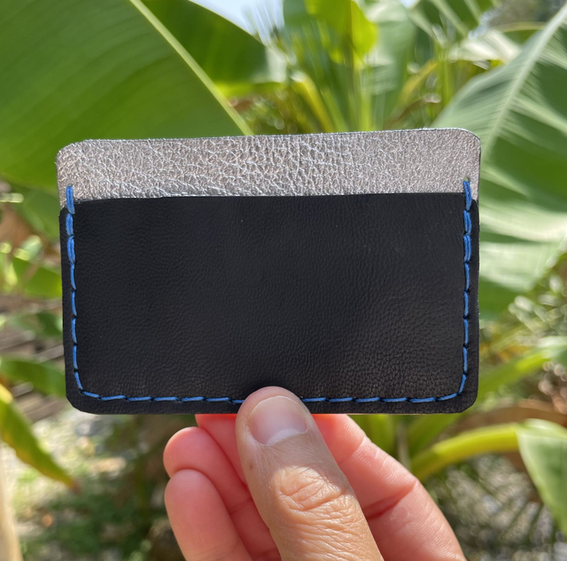 Porte-cartes Cloud minimaliste en cuir argent recto/verso (souple), bleu ciel (cuir rigide), et jaune (souple), avec 2 compartiments pour cartes ou autres papiers, finition des tranches en noir, couture faite à la main bleue.