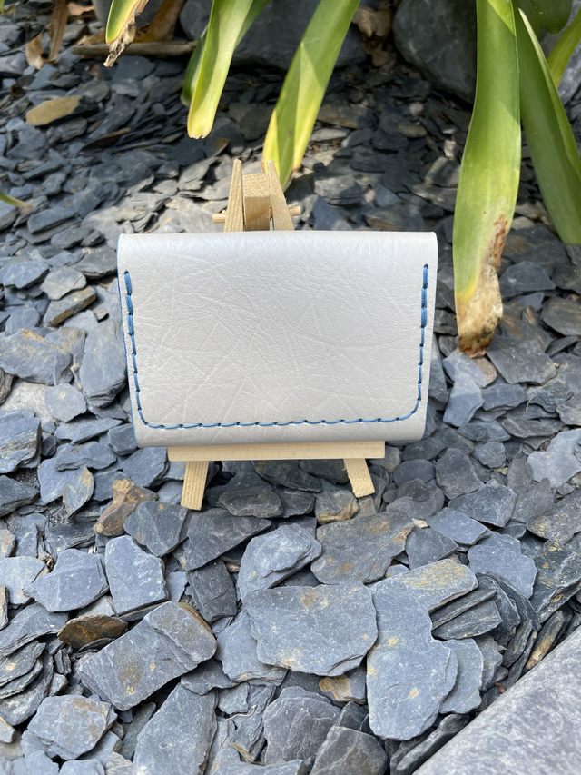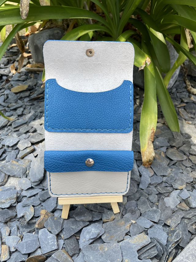 Porte-cartes/porte-monnaie en cuir ivoire irisé à motif à l'extérieur, en cuir grainé turquoise à l'intérieur, avec une couture turquoise, finition des tranches en turquoise.