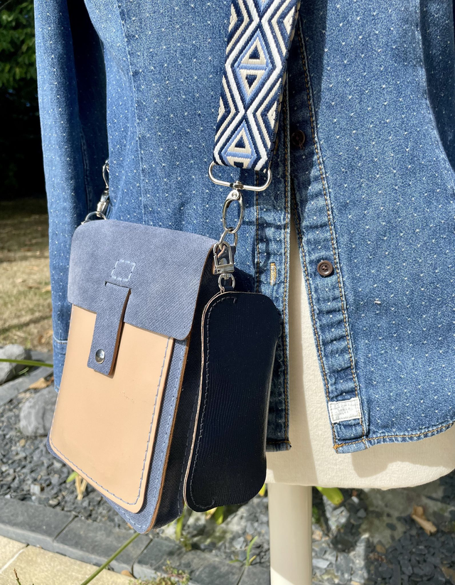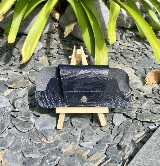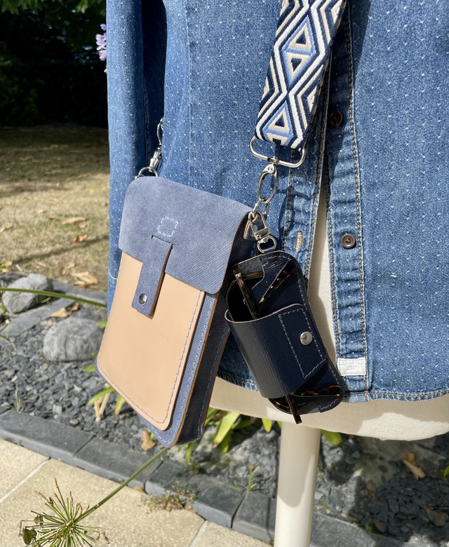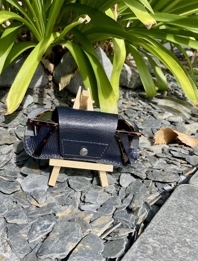 Etui à lunettes en cuir bleu nuit vernis, imitation reptile, avec couture bleu nuit faite à la main, mousqueton et bouton pression en nickel. Pratique à emmener partout avec son mousqueton qui peut s'accrocher à un anneau de votre sac ou autre, et ainsi gardez toujours votre paire de lunettes à portée de main.